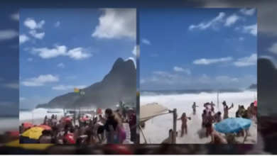 Bañistas que disfrutaban de la playa Leblon de Río de Janeiro, en Brasil, fueron sorprendidos por una enorme ola que…